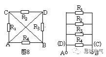 例4.如圖8所示,已知R1=R2=R3=R4=2Ω,求A、B兩點間的總電阻。