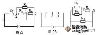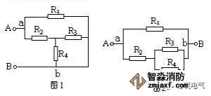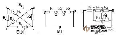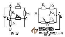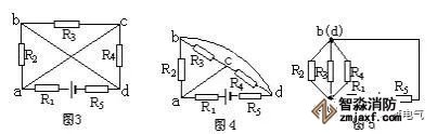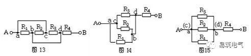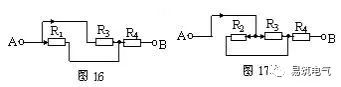 仍以圖13為例,設電流由A端流入,B端流出,先撤去R2,由圖16可知R1、R3有電流通過。再撤去電阻R1,由圖17可知R2、R3仍有電流通過。同理撤去電阻R3時,R1、R2也有電流通過由并聯電路的特點可知,R1、R2和R3并聯,再與R4串聯。