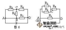 解:電流從電源正極流出過A點分為三路(AB導線可縮為一點),經外電路巡行一周,由D點流入電源負極。第一路經R1直達D點,第二路經R2到達C點,第三路經R3也到達C點,顯然R2和R3接聯在AC兩點之間為并聯。二、三絡電流同匯于c點經R4到達D點,可知R2、R3并聯后與R4串聯,再與R1并聯,如圖7所示。