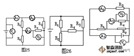 解:先將電流表去,用一根導線代摘替,再摘去電壓表視為開路,得圖26。然后根據圖25把電流表和電壓表補接到電路中的對應位置上,如圖27所示。