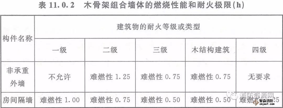 3、木骨架組合墻體的燃燒性能和耐火極限應符合表11.0.2的規定,其他要求應符合現行國家標準《木骨架組合墻體技術規范》GB/T 50361的規定。