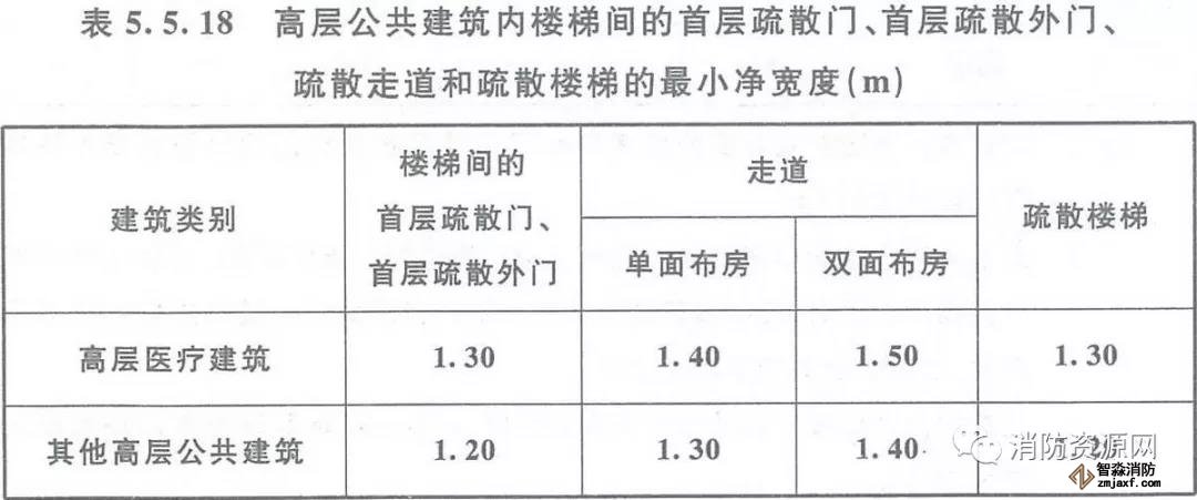 2、根據《建筑設計防火規范》要求(5.5.18):除規范另有規定外,公共建筑內疏散門和安全出口的凈寬度不應小于0.90m,疏散走道和疏散樓梯的凈寬度不應小于1.10m。高層公共建筑內樓梯間的首層疏散門、首層疏散外門、疏散走道和疏散樓梯的最小凈寬度應符合表5.5.18的規定。