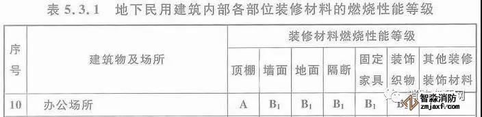 3、地下辦公建筑內部各部位裝修材料的燃燒性能等級,不應低于下表規定。(5.3.1)